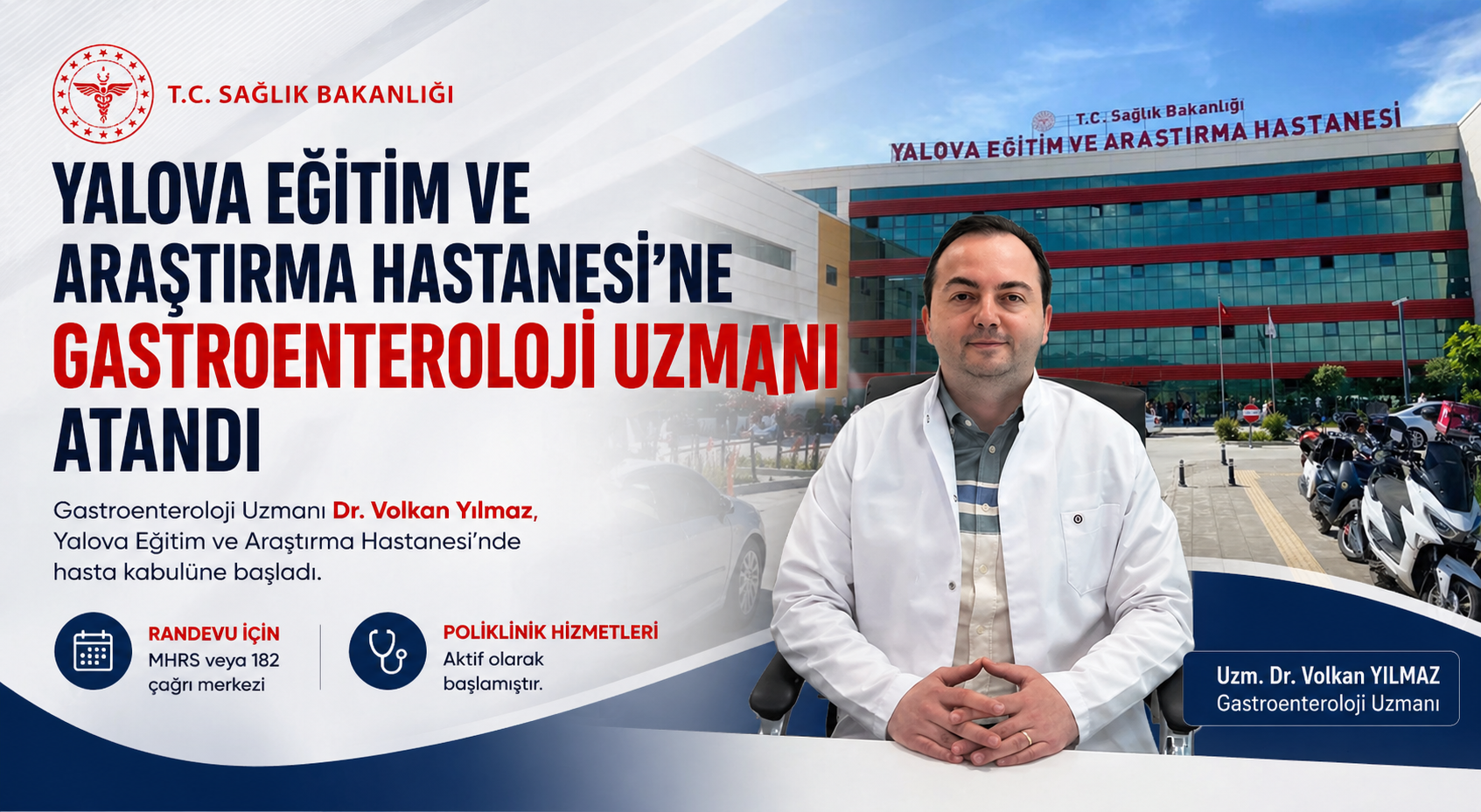 Hastane yönetimi tarafından yapılan bilgilendirmede, Gastroenteroloji Uzmanı Dr. Volkan Yılmaz’dan muayene olmak isteyen vatandaşların, Sağlık Bakanlığı’nın Merkezi Hekim Randevu Sistemi (MHRS) üzerinden veya 182 çağrı merkezini arayarak randevu oluşturabileceği bildirildi. Poliklinik hizmetlerinin aktif olarak başladığı kaydedildi.