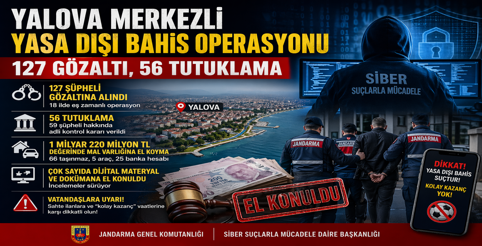 Yalova’nın da aralarında bulunduğu 18 ilde eş zamanlı düzenlenen operasyonlarda, yasa dışı bahis ve nitelikli dolandırıcılık faaliyetleri yürüten geniş çaplı bir şebekeye darbe vuruldu. Operasyon, Jandarma Genel Komutanlığı Siber Suçlarla Mücadele Daire Başkanlığı ile Mali Suçları Araştırma Kurulu (MASAK) koordinasyonunda gerçekleştirildi. Çalışmalar kapsamında toplam 127 şüpheli yakalandı.